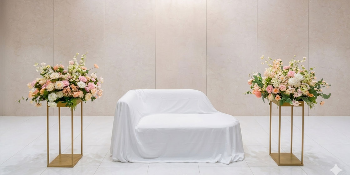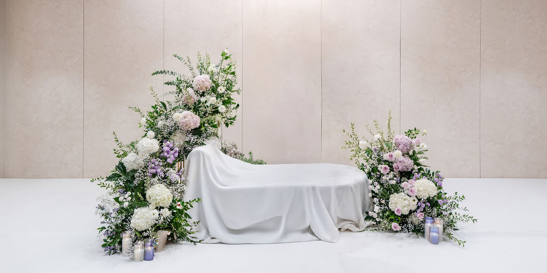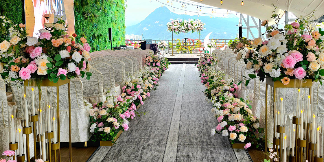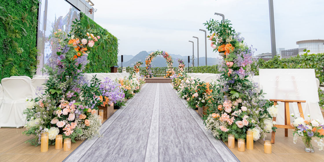 “A space that captures the most beautiful moments of love.” A 9-meter media wall spanning the entire front brings the couple’s story to life through a moving visual presentation. With flowers, light, music, and storytelling seamlessly combined, it offers an immersive wedding experience and can accommodate up to 250 guests.