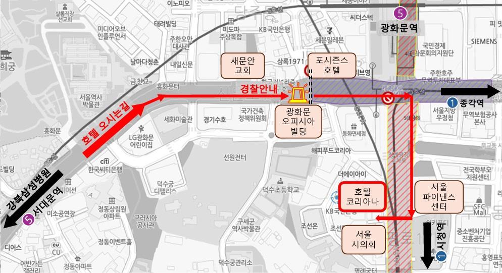 URL 참고 ■ 안전구역(호텔) 진입 안내 각 게이트별로 보안검색이 진행됩니다. ※ 게이트 위치 아래 URL 참고 ■ 자차 이용 안내 첨부 사진을 참고 부탁드리며, 해당 우회로는 3월21일(토) 16:00이후 차단됩니다. ■ 지하철 안내 5호선 광화문역 8번 출구(475M) ■ 지하철 무정차 통과 시 이용 가능 역 2호선 을지로입구역 1번